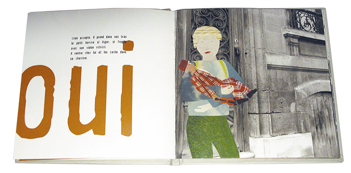 Le violon rétréci > La rencontre de Léon et Ilié un violoniste tsigane qui arrive au bout du voyage. Livre avec photographie noir et blanc et collage. Éditions La Cagouille 2004.