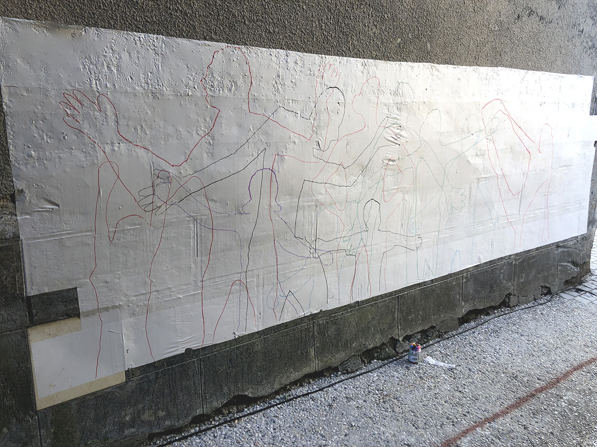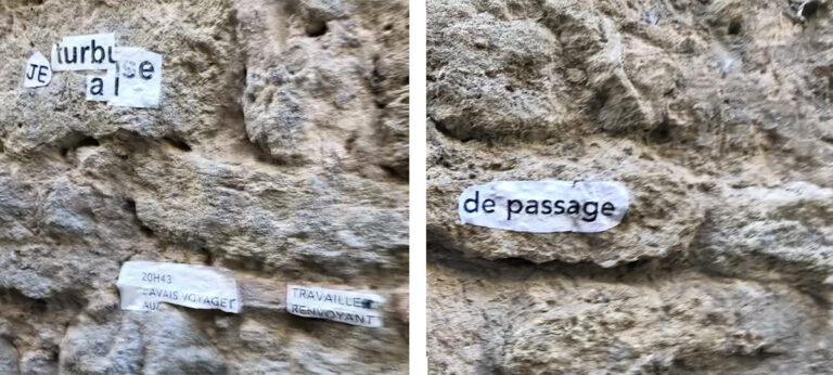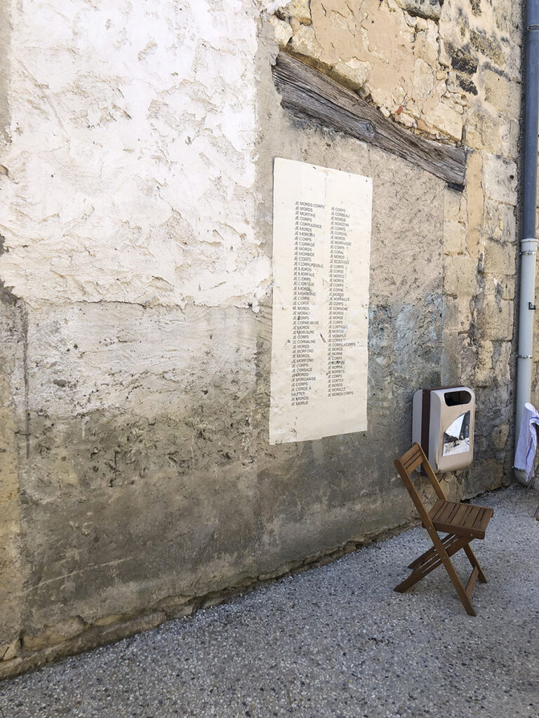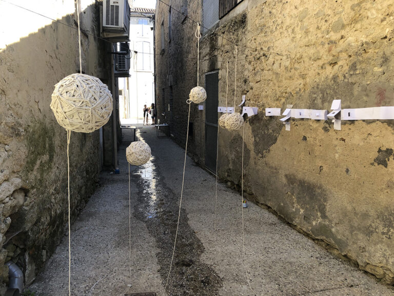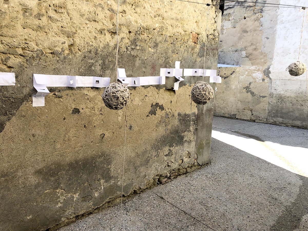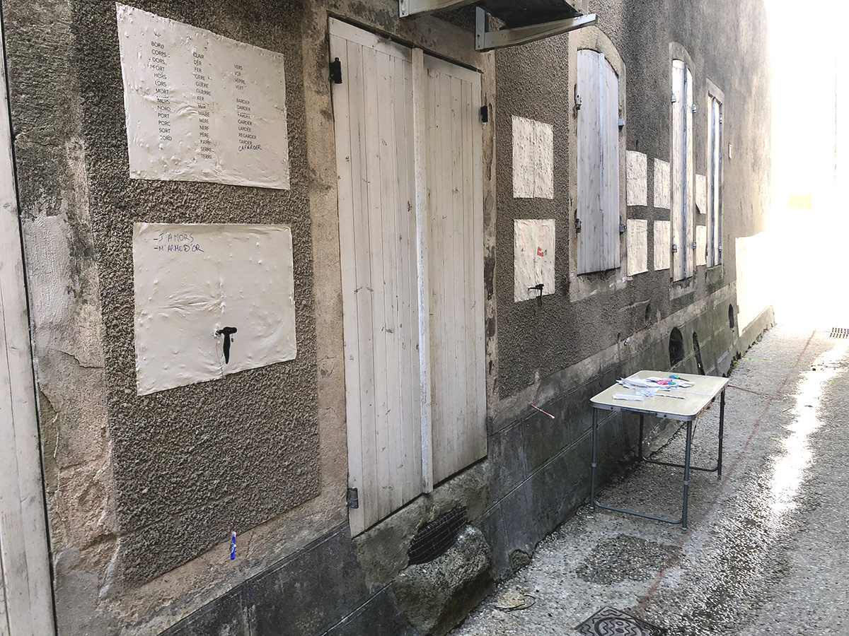 Cette installation a été pensée autour de l’écriture, du papier, du livre, de l’empreinte et du fil. Elle n’a duré que le temps d’un week-end, les passants pouvaient créer des listes, inventer des histoires, faire des papillons, défaire des nœuds, dessiner leur silhouette, participer à un cadavre exquis et suivre le fil rouge…